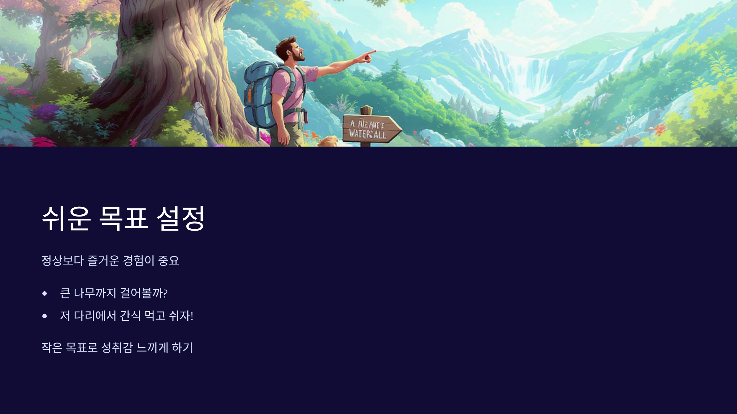 “저기 큰 나무까지 걸어볼까?”, “저 다리에서 간식 먹고 쉬자!” 이렇게 작은 목표를 세우면 아이가 성취감을 느끼고 재미있어해요.