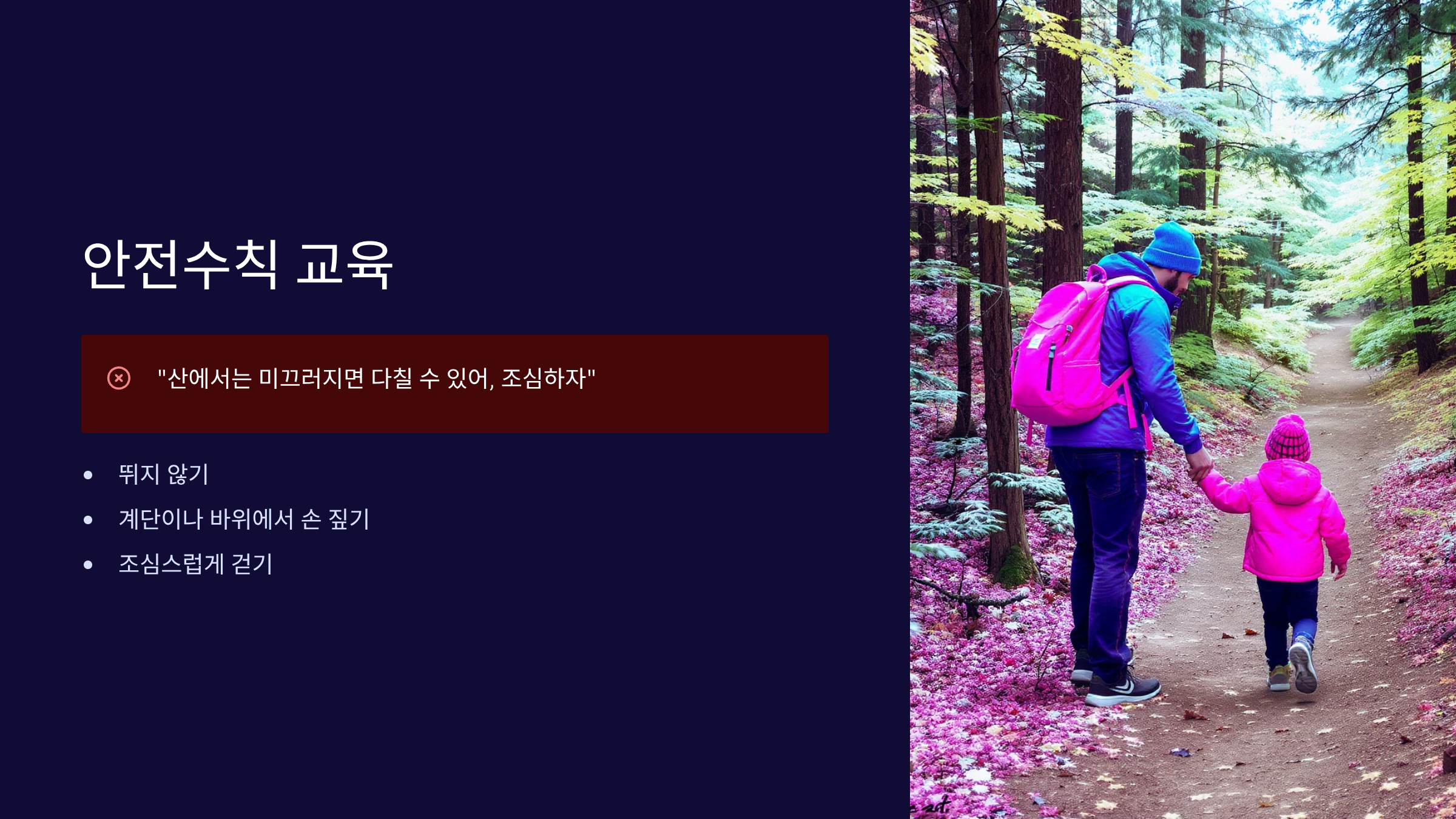 아이에게 산에서는 뛰지 말고, 계단이나 바위에서 손을 짚으며 조심스럽게 걸으라고 알려주세요. 저는 산에 오르기 전에 “산에서는 미끄러지면 다칠 수 있어, 조심하자”라고 미리 이야기해주는데, 아이가 의외로 잘 지키더라구요.