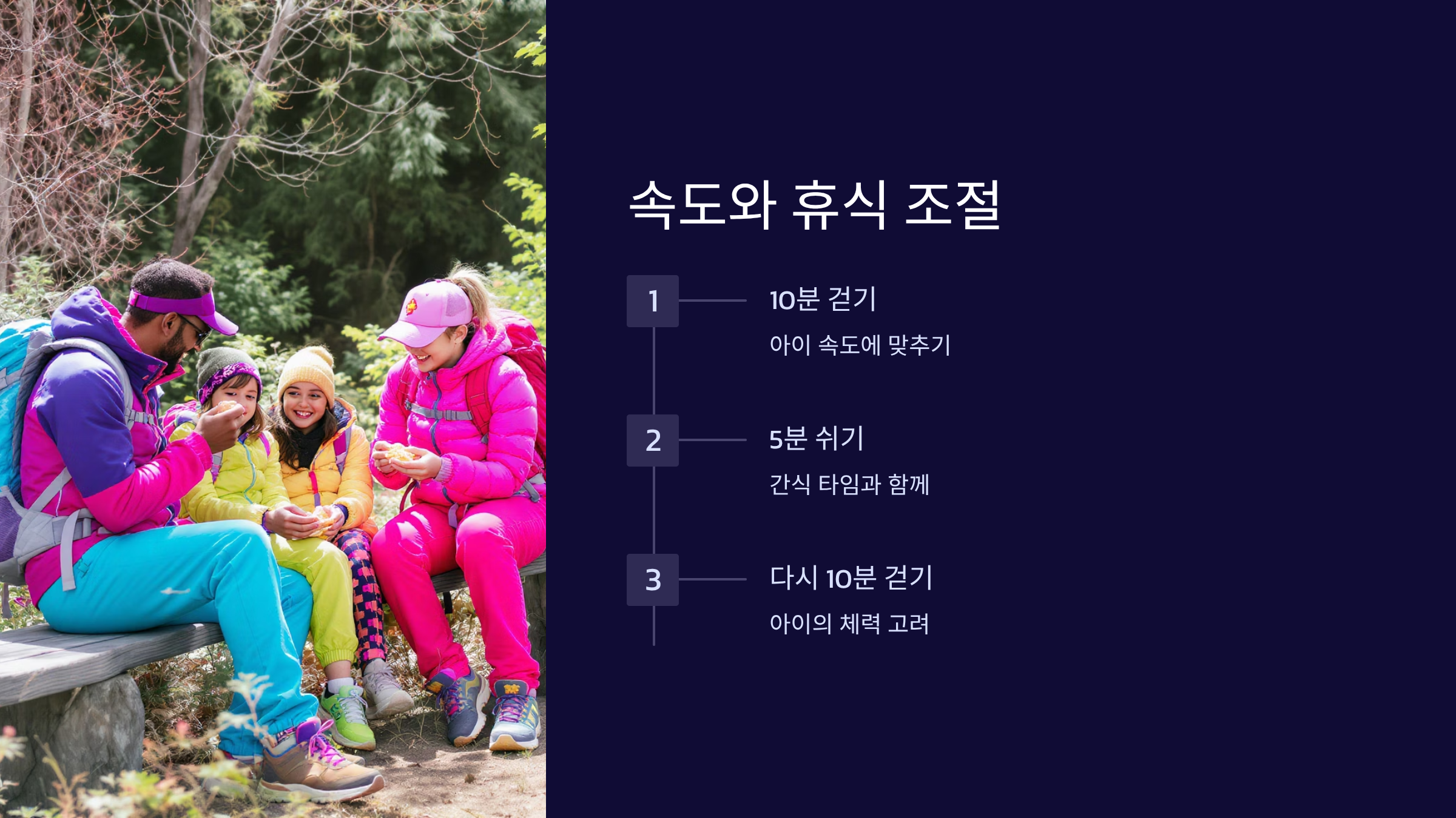 어른의 속도에 맞추면 아이가 금방 지쳐요. 저는 아이가 힘들어하면 10분 걷고 5분 쉬는 방식으로 진행했어요. 아이가 좋아하는 간식 타임을 휴식과 함께 주면 더 즐거워하더라구요.