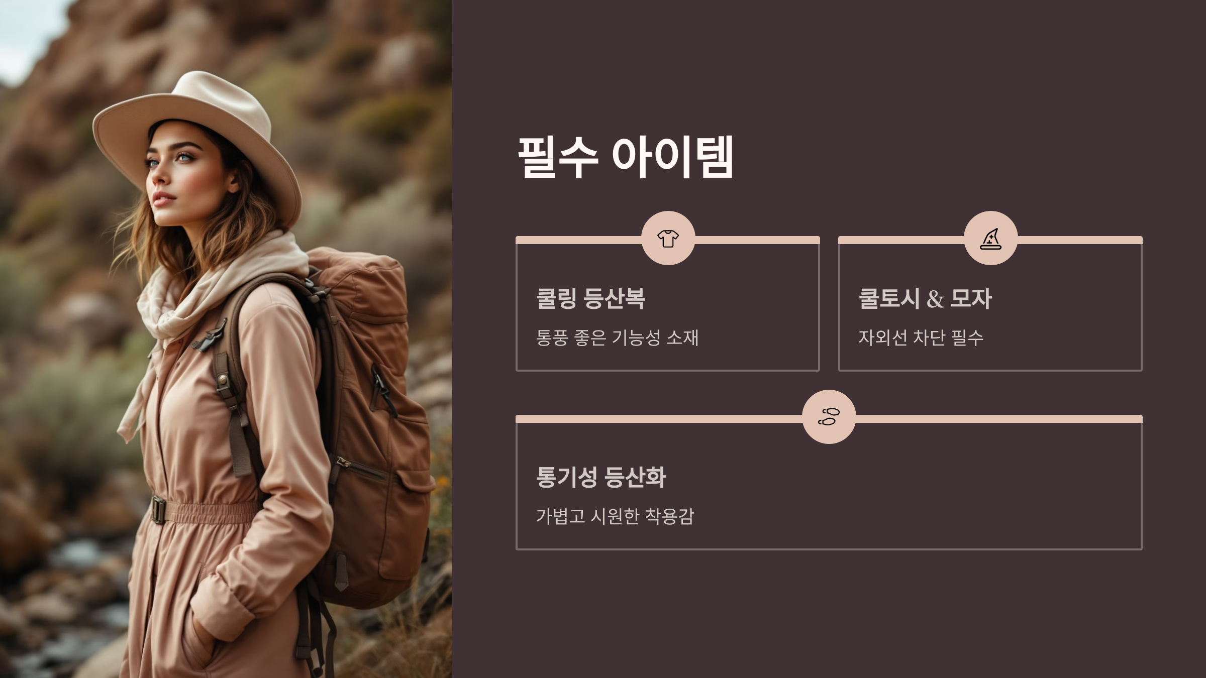 특히 쿨링 기능 등산복·아이스 타월·전해질 음료 이 세 가지는 꼭 챙기길 추천드려요.