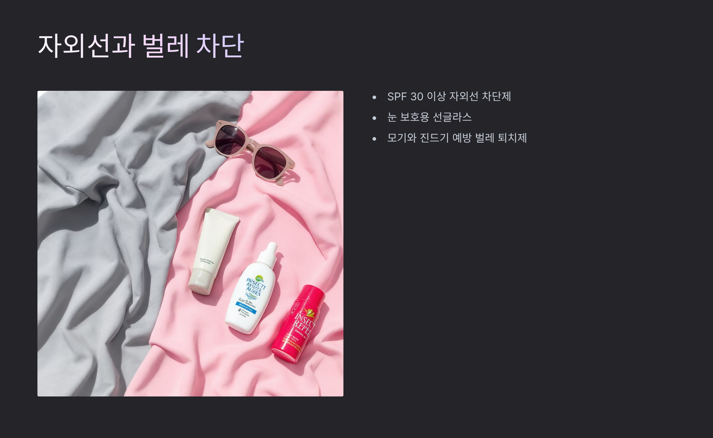 - 자외선 차단제: SPF 30 이상 제품을 수시로 발라주세요.